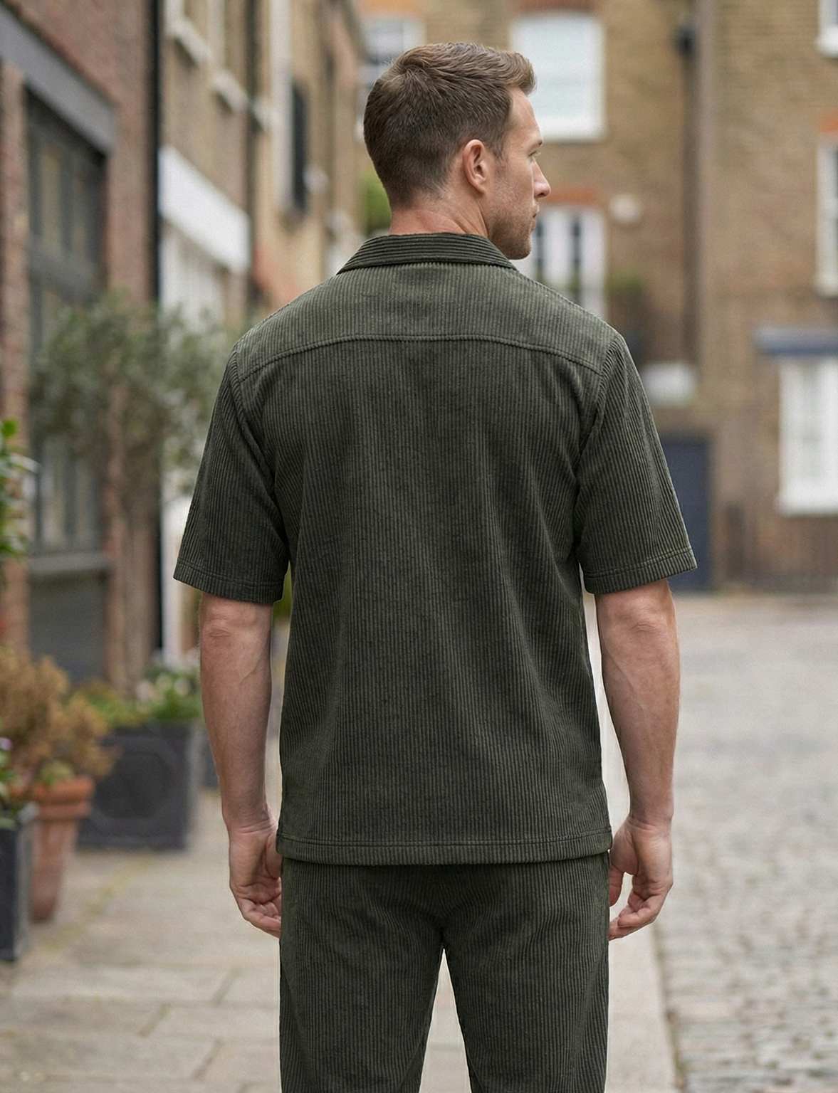 The Thomas Lounge Set in Forest Green offers a grounded, refined approach to everyday comfort. Designed with a soft ribbed fabric and a relaxed silhouette, this two-piece set blends practicality with understated style. The short-sleeve button-up shirt and matching trousers create a cohesive look suited for casual wear, travel, or laid-back evenings.